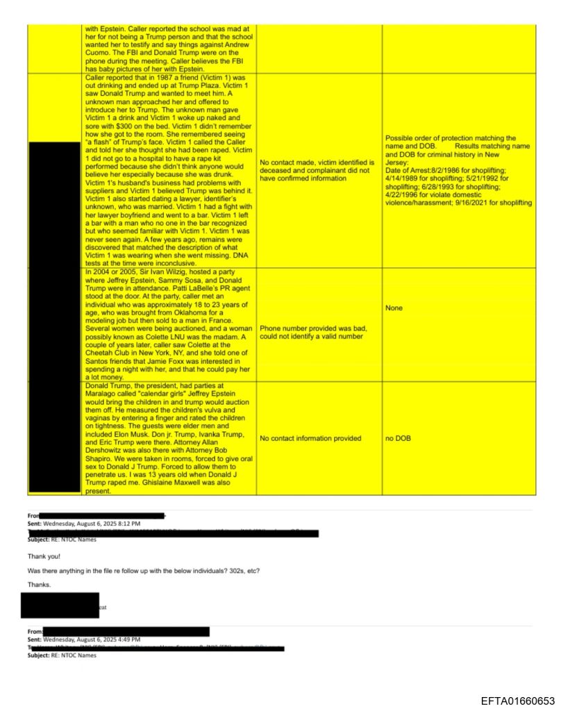 On August 6-7, the FBI compiled lists of “Trump accusers” to investigate, citing “salacious” claims. Time and resources were spent collecting criminal history, without visible indicators of whether the information within reports was thoroughly investigated.